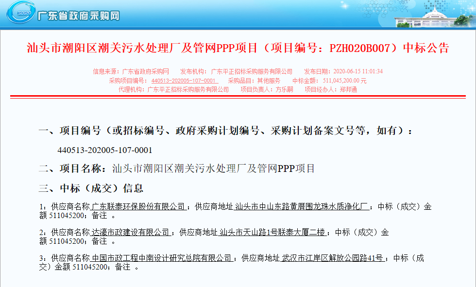 該項(xiàng)目通過(guò)公開(kāi)招標(biāo)方式選擇社會(huì)資本。根據(jù)2020年6月15日廣東省政府采購(gòu)網(wǎng)(http://www.gdgpo.gov.cn/)披露的《汕頭市潮陽(yáng)區(qū)潮關(guān)污水處理廠及管網(wǎng)PPP項(xiàng)目(項(xiàng)目編號(hào):PZH020B007)中標(biāo)公告》,經(jīng)法定程序,廣東聯(lián)泰環(huán)保股份有限公司(牽頭單位)、達(dá)濠市政建設(shè)有限公司和中國(guó)市政工程中南設(shè)計(jì)研究總院有限公司聯(lián)合體被確定為該項(xiàng)目中標(biāo)社會(huì)資本方。